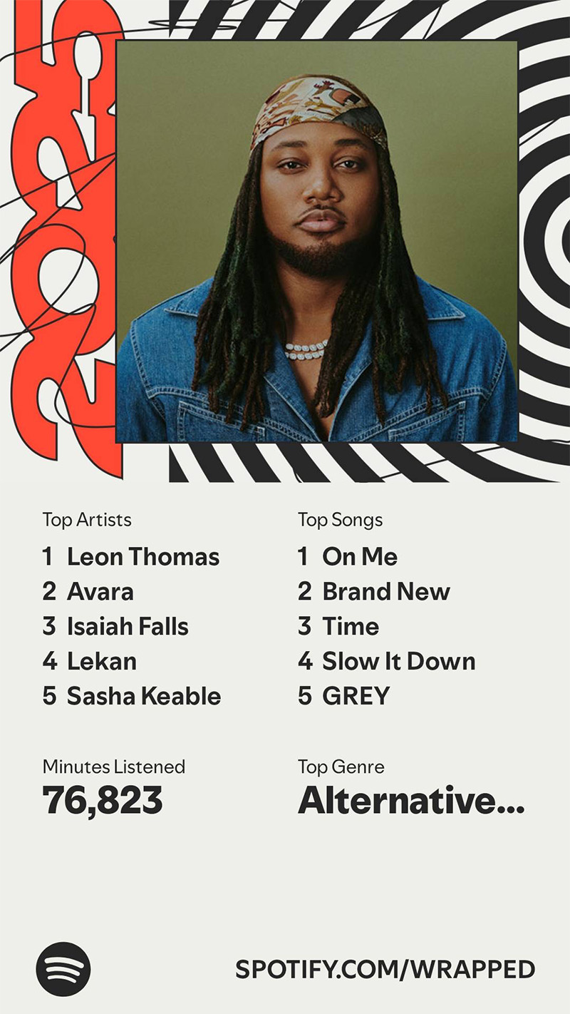 I can’t say I was surprised to see Leon Thomas sitting comfortably as my top artist. The man had a stellar run in 2025. Between dropping an incredible album (Mutt), blessing us with a standout EP (PHOLKS), and showing up on a few tracks by artists I love — including Sasha Keable — he stayed in rotation all year long. When an artist is that consistent, it’s only natural the numbers reflect it.